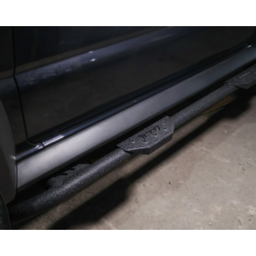 The Jimny Heavy-Duty Side Steps with Logo offer all the structural protection and access benefits of the standard heavy-duty side steps but include a laser-cut Jimny logo embossed into the step panel for a premium, personalised appearance. Constructed from high-grade steel with an anti-slip textured surface and durable powder-coated finish, they provide both rock protection and confident foot placement in all conditions. The Jimny logo detail adds a distinctive branded character that sets these steps apart from generic options. Factory chassis bolt-on fitment ensures a solid, vibration-free installation.