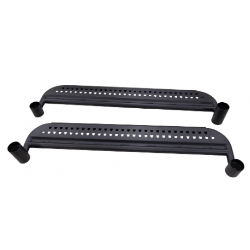 The Jimny Side Step and Rock Slider Model FS is a full-length side protection system for the Suzuki Jimny that combines the entry step functionality of running boards with the chassis-protecting capability of rock sliders. Manufactured from heavy-duty steel with a powder-coated black finish, the FS model features a full-length underside skirt that deflects rocks and trail obstacles away from the sills and chassis rails. The anti-slip step surface provides secure footing for vehicle entry and exit while the structural steel body takes the abuse of technical off-road terrain.