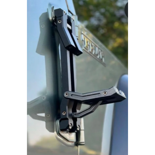 The Proman4x4 Door Step Hinge Type 2 delivers a heavy-duty step solution for the Mahindra Thar Roxx, constructed from aerospace-grade aluminium with stainless steel pins for maximum robustness and corrosion resistance. Its broader, aesthetically refined design complements the Thar Roxx's rugged character while ensuring safe and comfortable roof access. The matte finish integrates seamlessly with the vehicle's factory door hinges, providing rock-solid stability without any interference with the original door function. A direct bolt-on fitment ensures an easy, hassle-free installation suitable for any Thar owner.